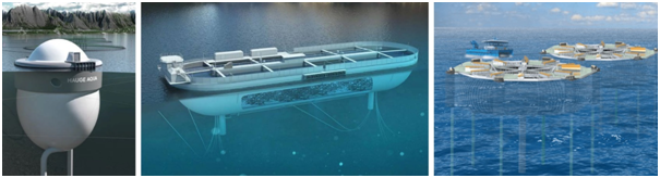 Figure 8 Impression of FCCS under development, The Egg (left, https://haugeaqua.com/), Stadion Laks (centre, https://stadionlaks.no/) and Marine Donut (right, https://eng.opd.no/hdpe-solutions/projects/marine-donut-a-new-technology-for-closed-fish-farming/).