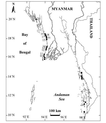 Local distribution. Tanintharyi coastal zone- St. Luke’s I., Lampi I., High I., Wa Maw, Nyawbyin, Mway Taung; Deltaic coastal zone- No data; Rakhine coastal zone- Mawtin Point, Ngwe Saung, Makyee, Maw Shwe Gyaing, Sin Phyu Gyaing, Moe Gyo Pyit Gyaing, Mazin.