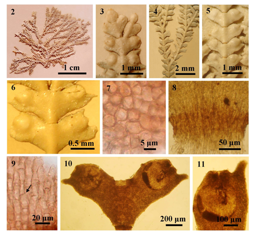 Figures 2-11 The external and internal structures of Jania spectabilis; (2) Habit; (3) Rounded tip of branches; (4) Thallus showing dichotomous branching; (5-6) Intergenicula with conceptacles formed marginally; (7) Surface view, showing cortical cells; (8) Longitudinal section showing uni-tiered geniculum; (9) Longitudinal section of intergenicula showing lateral fusion among cells (arrow); (10) Decalcified intergeniculum with conceptacles; (11) Tetrasporangial conceptacle.