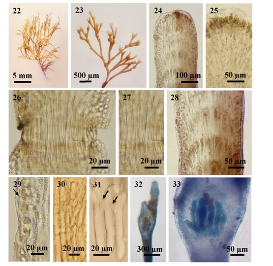 Figures 22-33 The external and internal structures of Jania rubens (Linnaeus) Lamouroux; (22) Habit; (23) Thallus showing dichotomous branching and cymoid clusters of conceptacles; (24) Longitudinal section of intergeniculum; (25) Longitudinal section of intergenicula showing apex of an intergeniculum with apical meristem and without cover cells; (26) Longitudinal section of geniculum; (27) Uni-tiered geniculum; (28) Longitudinal section of intergeniculum showing tiers of medullary cells; (29) Longitudinal section of intergeniculum showing cortex with a single layer of epithallium cells (arrow); (30) Tiers of medullary filaments; (31) Lateral fusions (arrows) among cells; and (32-33) Mature tetrasporangia.