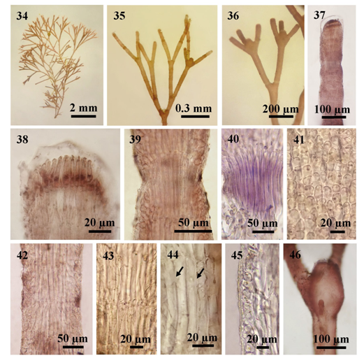Figures 34-46 The external and internal structures of Jania verrucosa: (34) Habit; (35) Thallus showing dichotomous branching; (36) Intergenicula with conceptacles; (37) Longitudinal section of intergeniculum; (38) Longitudinal section of intergeniculum showing apical cells; (39) Longitudinal section of geniculum; (40) Uni-tiered geniculum; (41) Surface view, showing cortical cells; (42-45) Longitudinal section of intergenicula: (42-43) Intergeniculum composed of medullary cells; (44) Lateral fusions (arrows) among cells; (45) Mature intergeniculum with two layers of cortical cells; and (46) Longitudinal section of conceptacle.