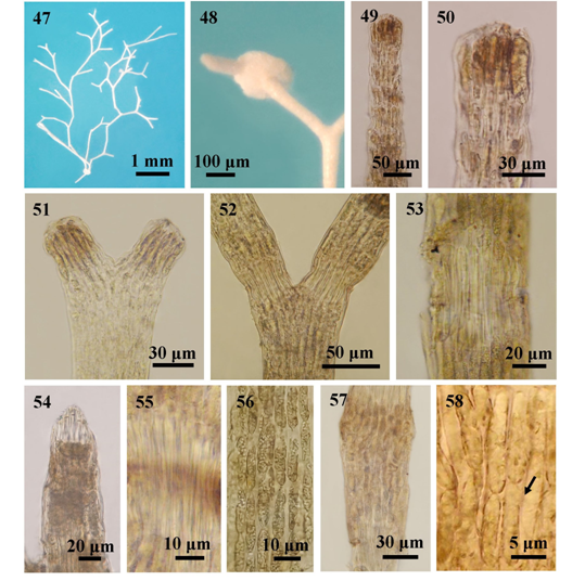 Figures 47-58 The external and internal structures of Jania capillacea; (47) Habit; (48) The accessory attachment discs; (49) Longitudinal sections of intergeniculum; (50) Longitudinal sections of intergeniculum showing apex of an intergeniculum with apical meristem and without cover cells; (51) A branch with initials of dichotomous; (52) Thallus showing dichotomous branching; (53) Longitudinal section showing uni-tiered geniculum; (54) Geniculum formed at the tip of intergeniculum; (55) Genicular filaments; (56) Surface view, showing cortical cells; (57) Longitudinal section of intergenicula showing tiers of medullary cells; and (58) Lateral fusion (arrow) among cells.