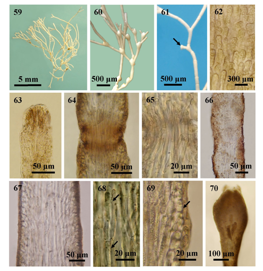 Figures 59-70 The external and internal structures of Jania adhaerens; (59) Habit; (60) A branch with antenniferous axial conceptacles in chain; (61) The accessory attachment discs (arrow); (62) Surface view, showing cortical cells; (63) Longitudinal sections of intergeniculum showing apex of an intergeniculum with apical meristem and without cover cells; (64) Longitudinal section showing uni- tiered geniculum; (65) Genicular filaments; (66-69) Longitudinal section of intergenicula: (66-67) Intergenicula with several tiers of medullary filaments; (68) Lateral fusions (arrows) among medullary cells; (69) Mature intergeniculum with cortical cells (arrow); and (70) Longitudinal section of mature tetrasporangial conceptacle.