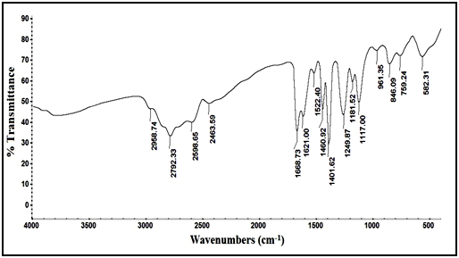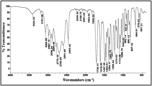 Confirmation of degradation product using IR techniques: IR spectrum of the intact lomefloxacin hydrochloride in Figure 4, showed peak of (C=O) of carboxyl group (-COOH) at 1726.31cm-1, while IR spectrum of degradation product in Figure 5, showed disappearance of (C=O) stretch of carboxyl group which indicate the cleavage of carboxylic acid linkage.