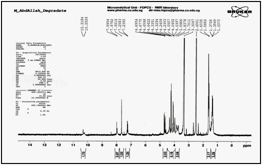 Confirmation of degradation product using 1H NMR techniques: The 1H NMR of the intact lomefloxacin hydrochloride in dimethyl sulfoxide (DMSO) in Figure 6, showed triplet signal of three protons of aliphatic (-CH3) in ethyl group at 1.323-1.358ppm, doublet signal of three protons of methyl group (-CH3) attached to piperazine ring at 1.745-1.762ppm, multiplet signals of seven protons in piperazine ring at 3.546–4.206ppm, multiplet signal of two protons (-CH2-) in ethyl group at 4.632-4.685ppm, singlet signal of one proton in benzene ring at 7.796ppm, singlet signal of one proton in pyridine ring at 8.902ppm, doublet signal of two protons (NH2) in piperazine ring at 10.198 - 10.315ppm and singlet signal of one proton (-COOH) in carboxyl group at 11.783ppm. The 1H NMR of the degradation product in dimethyl sulfoxide (DMSO) in Figure 7, showed disappearance of (-COOH) carboxyl group singlet signal at 11.783ppm indicating the cleavage of carboxylic acid linkage.