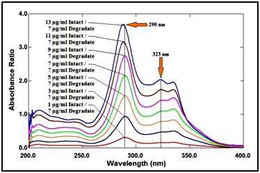 - For ratio difference method: The absorption spectra of intact lomefloxacin hydrochloride were divided by the spectrum of its degradation product (7µg/ml) then the difference in the peak amplitudes (ΔP) at the ratio spectra was measured at 290 and 323nm (ΔP290-323nm). The measured difference values in peak amplitudes (ΔP) versus the final concentrations in μg/ml were plotted to get the calibration graph and the regression equation was derived.