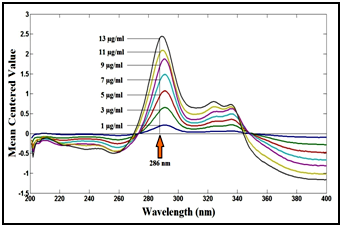 - For mean centering method: The absorption spectra of intact lomefloxacin hydrochloride were divided by the spectrum of its degradation product (7µg/ml) then the ratio spectra (from 200 to 400nm) were mean centered and the mean centered values were measured at 286nm. The measured mean centered values versus the final concentrations in μg/ml were plotted to get the calibration graph and the regression equation was derived.