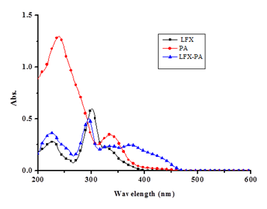 Figure 2 Absorption spectra of LFX [20µM], PA [20µM] and LFX-PA [20µM]in acetonitrile medium with slit width 1.0cm.