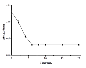 Time for formation of LFX-PA ion pair: The effect of time on the formation of ion pair was studied carefully and illustrated in Figure 3. An absorption intensity of PA at 235nm was monitored over the reaction time. The sharp decrease of band maxima at 235nm indicated progress of the reaction in terms of ion-pair formation. It is clear from the Figure 3 that complete formation of ion pair needs 5-6 minutes before filtration.