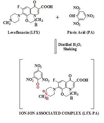 The fluoroquinolone contains a terminal nitrogen atom in its piperazine moiety which gets protonated in acidic medium to form positively charged quaternary ammonium group which in turn forms ion pair complex with anionic dyes. This work was undertaken in the presence of picric acid (PA) as one of the anionic dyes which contains three nitro groups and can easily generate negative charge on the hydroxyl group. The reaction scheme can be given as follows:
