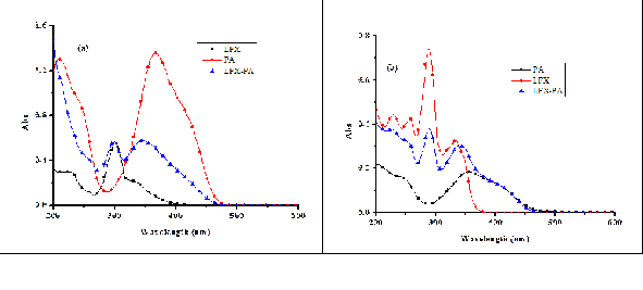 Figure 5 Absorption spectra of LFX [10-3M], PA [10-3M] and LFX-PA [10-3M] in (a) CH3CN:H2O medium (b) H2O medium (slit width 1.0cm).