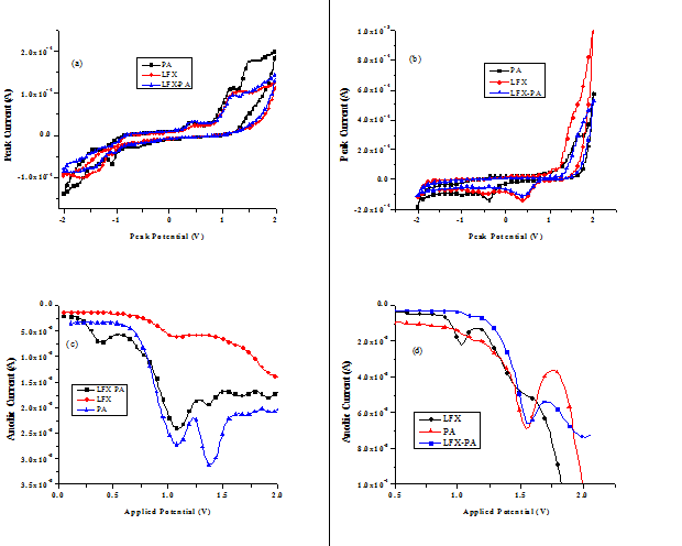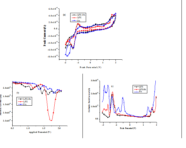 Ion-pair determination voltammetrically: Ion-pair formed from the interaction of drug LFX and PA was studied for its peak potentials by cyclic and differential pulse voltammograms. As observed from the voltammograms (Figure 7b), anodic peak of LFX-PA (1.64V) got shifted by 70mV when compared with peak potential of LFX (1.71V) with large decrease in peak current from 25.4µA to 9.2µA. In case of LFX-PA, new peaks at 0.90V, 1.12V, 1.45V, 1.64V and 1.88V also appeared. Similarly, in case of cathodic cycle, peaks at 1.63V, -0.80V, -1.62V and -1.92V appeared which proved the interaction of the PA and LFX. Deviation in the peak potentials of LFX-PA from that of PA and large difference in peak current values might be due to the interaction of PA with the drug LFX.