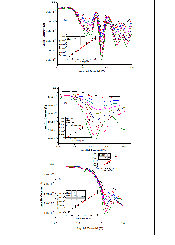 Figure 9 Differential Pulse Voltammograms of IP at different concentrations of LFX (15×10-4M - 60×10-4 M) in (a) CH3CN (b) CH3CN: H2O (c) H2O; Insets representating the calibration plots of their respective peak currents w.r.t. concentrations. (Ag/Ag+ as a reference electrode).