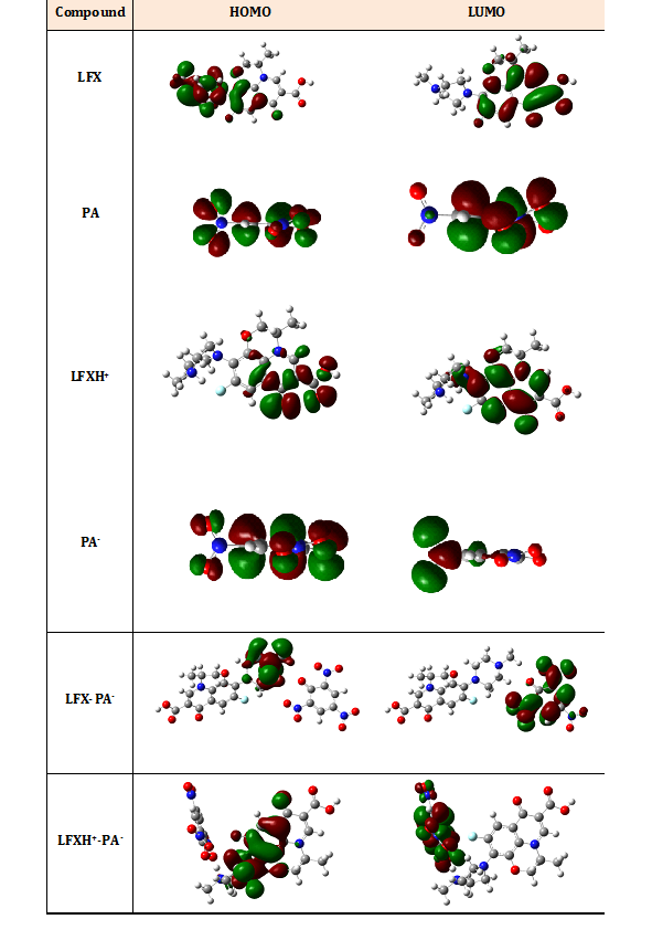 Computational study of LFX, PA, LFXH+, PA-, LFX-PA- and LFXH+-PA- was carried out on Gaussian 03W software. All the structures were optimized for minimum energy by using DFT calculations. Basis sets used for optimization of structures and complexes were B3LYP/6-31G in gaseous state. The complex (LFXH+-PA-) was assigned net zero charge and all the optimizations were carried out in ground state. The DFT calculations of two types of complexes i.e. ionized and unionized gives us the energy of HOMO, LUMO, energy gap and gas phase energy of LFX, PA, LFXH+, PA-, LFX-PA- and LFXH+-PA- as shown in Table 2. Surfaces of HOMO’s and LUMO’s of LFX, PA, LFXH+, PA-, LFX-PA- and LFXH+-PA- appear in Figure 10. Energy gap of LFXH+-PA- gets reduced after ion-ion association complex and leads to the stability of the interaction.