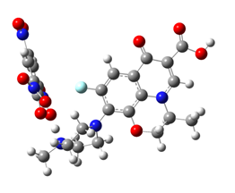 The DFT calculations show that in case of LFXH+-PA-, picric acid lies perpendicular to the plane of LFX and appears as a V-shaped structure as shown in Figure 11. Hydrogen ion of picric acid gets ionized and interacts with nitrogen of piperazine moiety of LFX. Bond distance between terminal nitrogen of piperazine moiety and ionized hydrogen is 1.06A◦, while bond distance between phenolate oxygen of PA and ionized hydrogen gets elongated and is 1.62A◦ as measured from optimized geometry of the complex.