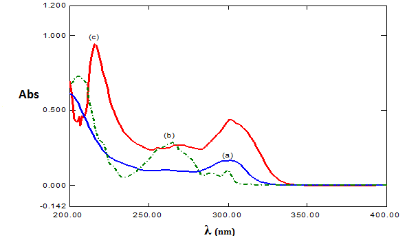 5.0µg/mL FMOC-Cl spectrum in the reaction medium has three absorbance peaks (206, 264, 300nm), the 10.0µg/mL of OMZ has maximum absorbance 0.164 at 300nm, and the derivatization product profile has two absorbance region (217, and 300nm) and it is clearly observed that the absorbance peak has increased.