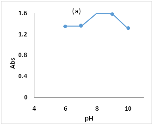 pH of the medium affects both FMOC-Cl and OMZ, in the alkaline media OMZ generates nucleophile and so the nucleophilic substitution reaction with FMOC-Cl will take a place,29 also OMZ decomposes in the acidic media. pH values control the derivatization and the hydrolysis products; the formation of FMOC-OMZ and FMOC-OH are produced simultaneously, and the concentration of FMOC-OMZ decreased as FMOC-OH formed. in present procedure variation of pH values (from 6.0 to 10.0) of BBS 0.2molL-1 revealed that the FMOC-OMZ production increased gradually till pH 8.0 [the highest absorbance value]and decreased after that due to FMOC-OH quick formation (35), so pH 8.0 has been chosen as optimum (Figure 3a).