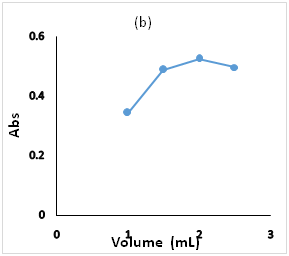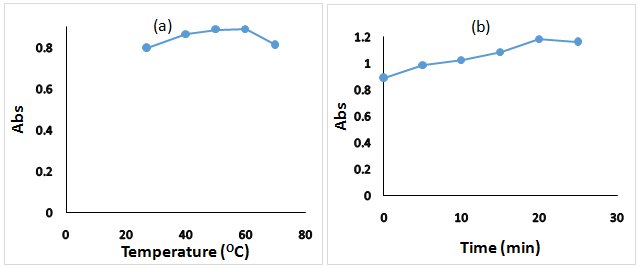 OMZ is sensitive and decomposes at high temperature,32 the effect of the reaction temperature was investigated, and the result showed that the absorbance increases while the temperature increase in the range of (29–600C), then decreases due to the decomposition of OMZ (Figure 4a). The reaction time effect is important to ensure the completion of the substitution reaction, the spectrum of the product in the time (0 to 20 min) revealed that the variation of the absorbance was not significant (about 0.2), so that direct measurement was determined as optimum (Figure 4b).