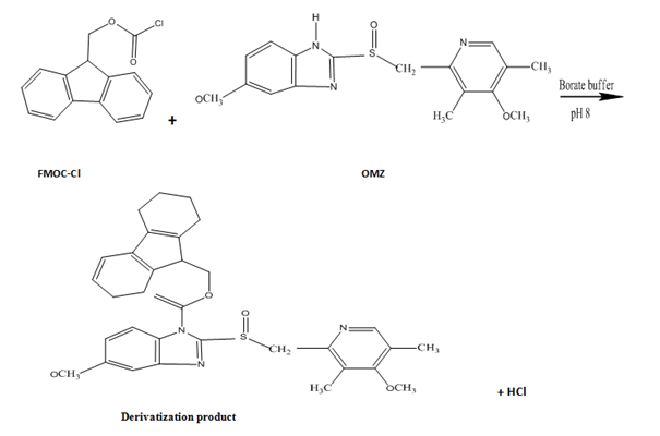 FMOC-Cl reacts with primary and secondary amines by nucleophilic substitution in two minutes at buffer pH 8.0 giving stable derivative, and it combines with imidazole ring of amino compounds.28 OMZ has imidazole moiety that could react to form FMOC-Cl derivative (Scheme 1).