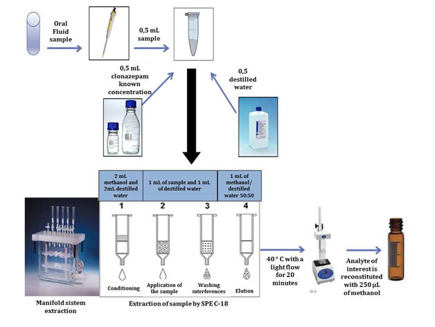After collection of a pool of saliva samples, 0.5mL of oral fluid is then taken, and then 0.5mL of known solution of Clonazepam and 0.5mL of distilled water is added. After vigorous stirring for 5 minutes, the analyte is extracted into the sample in four steps which used the vacuum extraction system of SPE, where each cartridge C-18 is conditioned with 2mL of methanol and 2mL of distilled water. Subsequently 1mL of sample and 1mL of distilled water is added. Elution of the analyte of interest remaining in the cartridge is collected using 1mL of 50:50 methanol/distilled water. The sample is then left in a nitrogen concentrator at a temperature of 40°C with a light flow for 20 minutes. Finally, the analyte of interest is reconstituted with 250μL of methanol and then added in a chromatography vial. This procedure is presented in Figure 1.