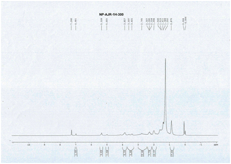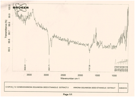 Phytochemical screening result is shown in Table 1. Percentage yield of crude extract of petroleum ether extract and Ethanol extract were 78.52 % and 89.93% respectively. Considering the polar nature of active phytoconstituent, the ethanol extract was more preferable for the further experiment. In the thin layer chromatography using mobile phase ethyl acetate methanol water in ratio of 100: 13.5: 10 the retention factor (Rf) of the ethanolic extract was 0.90. (i.e. mentioned mobile phase composition was used for better separation of steroidal or cardiac glycoside). HPLC data (Figure 1) shows that in retention time 2.272 minutes, a single peak shows the presence of a single compound in the isolated ethanolic extract of Annona squamosa seed. From the IR spectra (Figure 2), It can be concluded that, transmittance at 3628 cm-1is due to -OH stretching, transmittance at 2921cm-1 is due to -CH stretching, transmittance at 1737 cm-1is due to ˃C=O stretching. The compound, can be concluded to contain an alkyl group (-CH3) group, hydroxyl (O-H) group and a carboxyl (C=O) group. From the 1H NMR spectra (Figure 3). It can be concluded that, Chemical shift value at 0.8, is due to a primary proton. Chemical shift value at 1.38 is due to a secondary proton, Chemical shift value at 1.5 is due to a tertiary proton, Chemical shift value at 3.6 - 3.5 is due to ester / ether linkage, Chemical shift value at 2-2.7 is due to carboxyl group, Chemical shift value at 6-7 is due to an aromatic ring, Chemical shift value at 4.6-5.9, is due to vinylic carbon. (C=C-H). The compound can be concluded to contain a primary proton, two secondary protons, two tertiary protons, an ester /ether linkage five carboxyl groups, an aromatic ring, and two vinylic carbons.