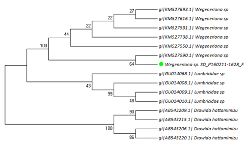 The genomic DNA was isolated from the earthworm tissue and subjected to amplification using COI specific universal primer (Figure 2). A fragment of 649 bp was amplified and photographed (Figure 3). The sequencing analysis revealed that the earthworm belong to Wegeneriona sp. In order to find the relatedness to other organisms phylogenetic tree was constructed by maximum likelihood analysis and results showed closeness towards Wegeneriona sp (Figure 4). Taxonomy and molecular techniques were used to express in a taxonomically included technique of new species of earthworm. COI sequences for detecting species level differences even in cases of recent divergence. Furthermore, they indicate that COI divergence may help to clarify misleading morphological classifications.14 The DNA sequencing of holotype helps the account of a new species by confirm that the taxonomically diagnostic matches with its position in the phylogeny. In addition, prospective incongruence is easily visible on a phylogenetic tree. This study makes available confirmation that a COI – based identification system would be successful for identifying earthworm species.