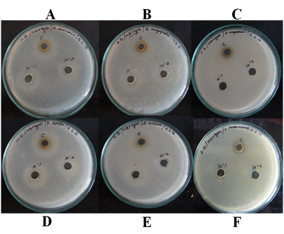 Figure 5 Minimum inhibitory concentrations for earthworm skin extraction AMP against A. Klebsiella pneumonia, B. Bacillus aryabhattai, C. Bacillus megaterium, D. Pseudomonas putida, E. Staphylococcus aureus, F. Serratia marcescens, with different concentration. S. marcescens is only clear zone for appear.