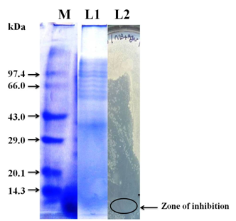 SDS-PAGE was performed according the method of13 electrophoretic apparatus. 12% separating and 4% stacking gel were used to separate the proteins. Gel electrophoresis was carried out with SDS and β-mercaptoethanol in the loading buffer. A sandwich was made with two glass plates separated by Spacer Strip (1.5mm thickness). Loading buffer of pH 6.8 (60mM Tris base, 5% SDS, 1% β- mercaptoethanol, 0.002% bromophenol blue and 6% glycerol) was added to the sample. Per well 50μl samples were loaded. SDS-PAGE was run until the bromophenolblue front reached the end of the gel (30 V for stacking gel and 50 V for separating gel was applied). After completion of electrophoresis gel was stained with coomassie brilliant blue and destained subsequently with excess of methanol in destaining solution. The zymogram analysis for gel was water washed 2 to 3 h, and then nutrient agar plate was prepared. 0.75% soft agar preparing then seeded S. marcescens. The plate was incubated 37°C for 24 h.