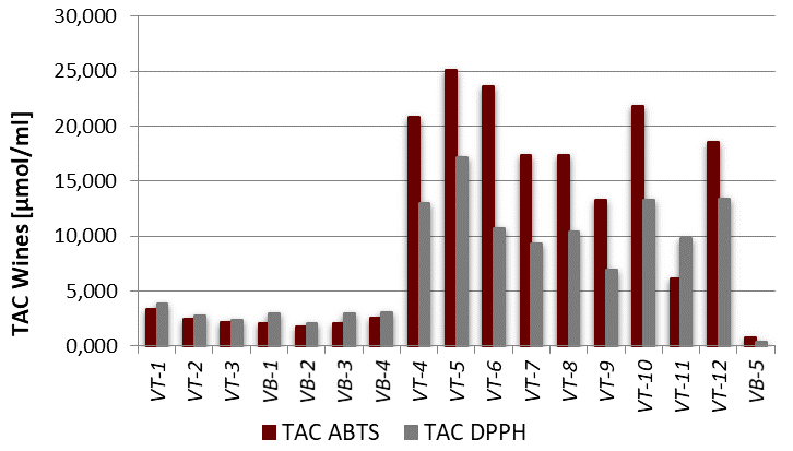 The results of the evaluation of the antioxidant activity in the different wines analyzed exhibited strong antioxidant activity, which are shown in Table 2, Graph 1. The results of the statistical analysis for the antioxidant activity ABTS and DPPH are in the range of 2,123 at 25.097 [µmol/ml] and 2.348 to 17.138 [µmol/ml] for red wines respectively, while for white wines the ranges fluctuate from 0.793 to 2.604 [µmol/ml] and 0.419 to 3.07 [µmol/ml] respectively. These results show us that there are significant differences in the different wines evaluated, where red wines present higher antioxidant activity than white wines.
