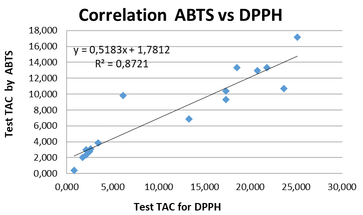 The correlations obtained by linear regression between both tests (ABTS and DPPH) is significant, which indicates that the total antioxidant capacity in wines can be measured indistinctly with any of these tests.