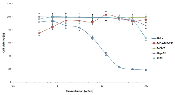 The cell lines are HeLa (cervical), MDA-MB-231 and MCF-7 (breast), Hep G2 (liver) and L929 (normal) cell lines. Each point shows the percentage of viable cells compared to negative control, DMSO.