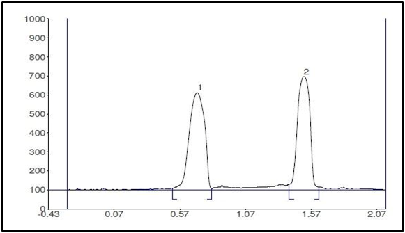 Figure 2 Two-dimensional densitometric chromatogram of (1) TMP (6µg/spot) and (2) PHZ (4µg/spot) at 228nm.
