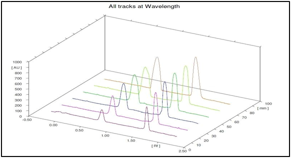 Figure 3 Three-dimensional densitometric chromatogram of TMP (1–10µg/spot) and PHZ (0.5–6µg/spot) at 228nm.