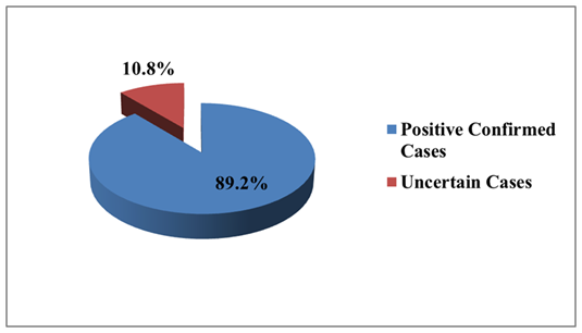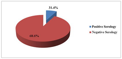 Among the 89 collected samples, 28 positive cases and 61 negative cases have been recorded with the Rose Bengal test; that is a prevalence of 31.4% (P. value = 0.002) (Figure 1). These positives cases were found in the professional category of meat carvers and cleaners in frequent contact with the marshy area used for dumping of slaughterhouse wastes (slaughterhouse did not use the incinerator).