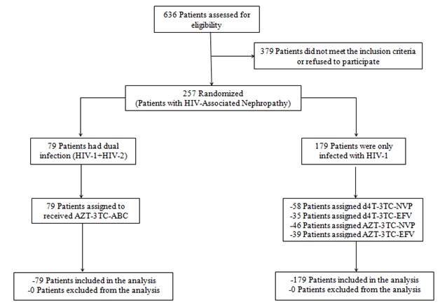 We found 636 cases of nephrotic syndromes during our study period, of which 257 cases of HIV-associated nephropathy were registered and included in our study, that is a prevalence of 40.4% with 79(30.8%) cases for patients with dual infection (HIV-1 and HIV-2) and 178(69.2%) cases for patients only infected with HIV-1 (p= 0.001).