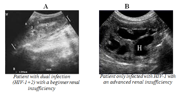79(30.8%) patients among the 257 cases of HIV-associated nephropathy had a dual infection (HIV-1 and HIV-2) compared with 178(69.2%) cases for patients only infected with HIV-1. Patients with dual infection (HIV-1 and HIV-2) had a nephropathy with a beginner renal insufficiency compared to those only infected with HIV-1 who presented an advanced renal insufficiency in 96.6% of cases (Table 3). This difference observed among patients with dual infection (HIV-1 and HIV-2) could be explained by the low replicative capacity of HIV-1 in case of coinfection with HIV-2.27 Thus, HIV-1 replication more virulent and faster at the renal level and in the absence of coinfection with HIV-2, leads to cellular changes (apoptosis and phenotypic changes in epithelial cells) and the synthesis of a high rate of inflammatory mediators (including TGFβ and TNFα). These two mechanisms lead to the rapid progression of lesions observed towards the end stage of the renal insufficiency.28,29 In vitro studies have shown that HIV-2 infection generates higher levels of natural beta-chemokine ligands than CCR5 HIV co-receptor mononuclear peripheral blood cells and that this may inhibit HIV-1 infection and its replication at the renal level.20,28,29