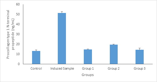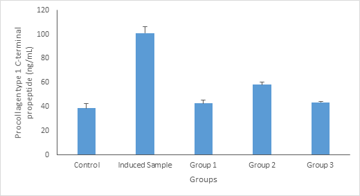Figure 3 Procollagen type 1 C-terminal propeptide (ng/dL) concentration. Values are given as Mean ±SE of the independent experiment performed in triplicate. Group 1 = Standard drug (Ca); Group 2= Treated with 100mg/kg body weight of Launaea taraxacifolia; Group 3 = Treated with 200mg/kg body weight of Launaea taraxacifolia.