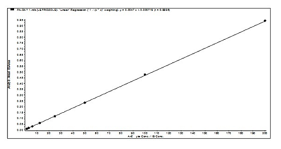 Specificity, selectivity and linearity: Following plasma calibration standards (ng/ml) were prepared - 1.56, 3.12, 6.25, 12.5, 25, 50, 100, 200 and quality control samples were prepared as 1.56ng/ml (LLOQ), 4.68ng/ml (LQC), 75ng/ml (MQC) and 150ng/ml (HQC). The proposed assay was linear in the range of 1.56ng/ml to 200ng/ml in plasma. The representative calibration curve (code no. LIN I) was presented in linearity graph (Figure 5). Back calculated concentrations of the calibrant samples of the linearities and their statistical analysis were also represented in Table 2. Representative chromatograms of the quality control samples (LLOQ, LQC, MQC and HQC) were given as Figure 6. The lower limit of detection (LLOD) and lower limit of quantification (LLOQ) were found 0.43ng/ml and 1.56ng/ml, respectively.
