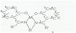 The co-ordination of Salen to metal ions is influenced by the tetradentate property and electronic relevance of the donor atoms. Studies7 shows that it forms planar complexes with various transition metal ions and nitrogen atoms in the ligand have a higher tendency to co-ordinate with metal ions than the oxygen atoms, a consequence of increased basicity of nitrogen atoms over the oxygen atoms. Salen form complexes with metal ions through nitrogen and oxygen donor atoms2 and the metal core can be finely tuned through the appropriate selection of electron - withdrawing or electron donating substituent of different size in the Salen ligands.