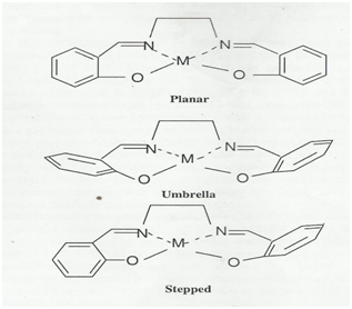 Complexes of Salen has been noted20,21 to assume square planar geometry where the metal ion is in the plane formed by the N2O2 donor atoms and solvent molecules or other molecules co-odinates at the two axial positions. In some cases however, the bridge between the imine moieties forces the cis-configuration around the metal centre to a slightly distorted tetrahedral geometry. Cozzi6 has shown that other geometries exist for metal salen complexes where the folding of the six numbered metallocycles and the atoms and centre deviate from the plane defined by the N2O2 donor atoms and may assume an umbrella, stepped or planar molecular conformation as shown in Figure 5.