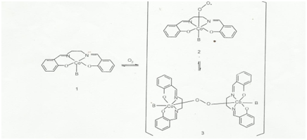 Co(Salen) is the first reported synthetically reversible Co(II) oxygen carrier capable of binding dioxygen in the solid state, believed to form O2 adduct consisting of dimeric Co(Salen)2 O2 units and said to be inactive.46 Co(Salen) binds oxygen similarly to iron in the form of ferrous heme in proteins such as myoglobin and hemoglobin.