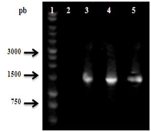 Figure 1 PCR amplification of the 16S DNAr gene of the isolated Xanthomonas strains. The position at ~1500bp corresponds to 16S DNAr gene. 1: Molecular weight marker; 2: Negative Control; 3-5: Isolates 2044, 2059 and 2093, respectively.