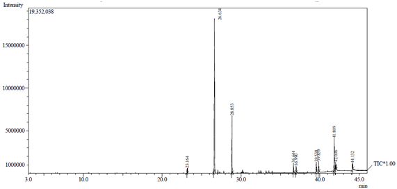 Analysis of AGME 24-28 in CG/MS showed the presence of ten fatty acids (Table 1), identified by the molecular ions.M + (consistent with the respective molecular formulas) corresponding to the respective methyl esters represented by the peaks with retention (RT) and percentages (%) in the total ion chromatogram (Figure 1).