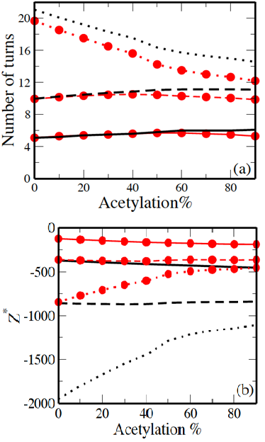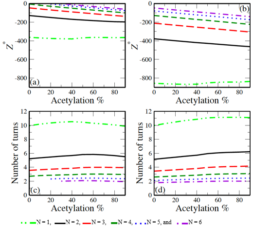 Figure 5 (a) Net charge, and (b) number of turns on a complex formed when NG5 dendrimers compacted with 184 nm semiflexible ssDNA (b=0.34) (a) and (c), and semiflexible dsDNA (b=0.17) (b) and (d), as a function of acetylation %.