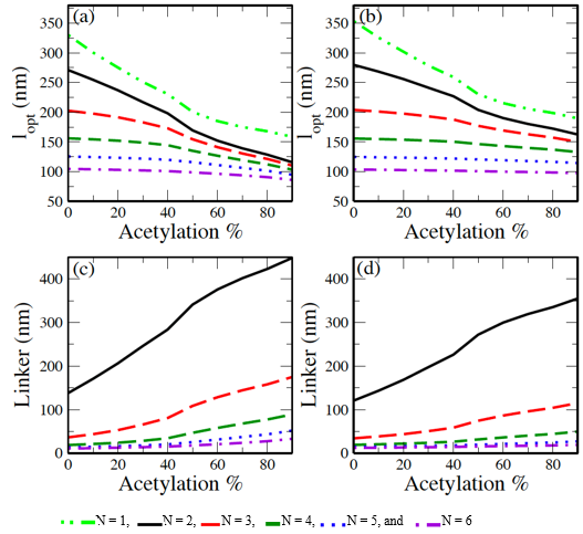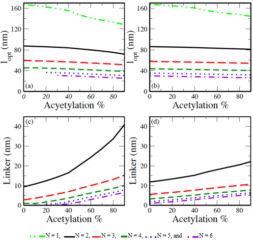 Figure 4 (a) and (b) lopt, and (c) and (d) Linker formed results of condensing 680 nm semiflexible ssDNA (b=0.34) (a) and (c), and semiflexible dsDNA (b=0.17) (b) and (d) as a function of acetylation %.