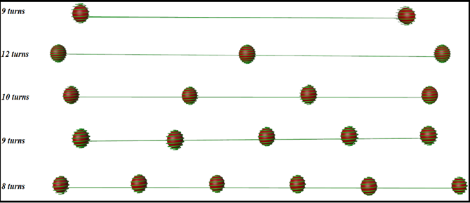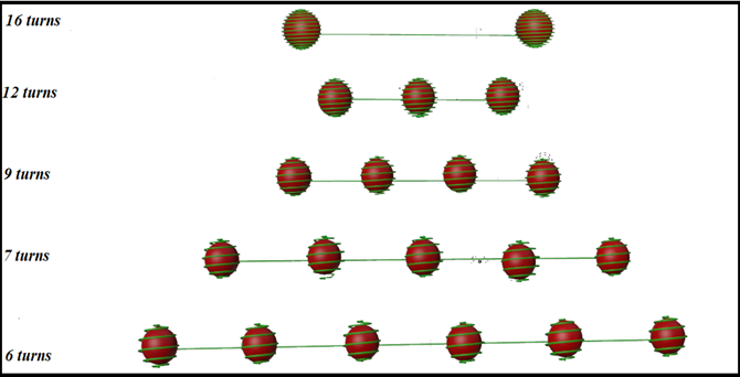 The number of turns wrapping around a dendrimer for complexes using a chain length of 680 nm in the case of using dsDNA, and a number of dendrimers ranging from 2 to 6 is illustrated in 3D images at 0%, 40%, and 90% acetylation in Figures 7,8 and 9, respectively.