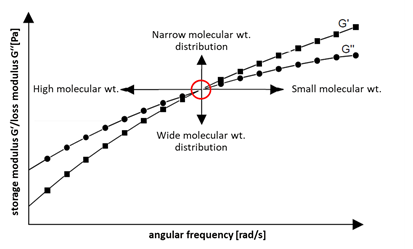 Additionally, the crossover point of G’ and G’’ was determined for all the samples (Table 1). Crossover is the point at which the material changes its viscoelastic behavior from a more elastic to a more plastic behavior.24–28 For a given polymeric material, the crossover point is very sensitive to variations in the MW and MWD as schematically depicted in Figure 2.15