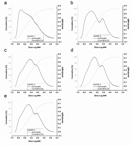 In Figure 3, the weight-normalized chromatogram peak area and cumulative amount are plotted against Mw to illustrate the contributions of the different MW fractions to the overall MWD of the samples. It becomes obvious from these plots that within each viscosity grade set no two lots were identical, especially the high viscosity grade set (NaCMC 1 and NaCMC 2). According to Figure 1a, NaCMC 1 is predominately composed of high MW population (long polymeric chains) compared to NaCMC 2 (Figure 1b) which has a very significant amount of low MW population (short polymeric chains) in addition to the high MW population. This explains and agrees with the fact that the measured complex viscosity, |η*| of NaCMC 1 was about a decade order of magnitude higher than NaCMC 2, as the former is predominantly composed of long polymeric chains which contributes to its markedly different elastic behavior. Comparing the medium viscosity grade in Figures 3, all three lots show bimodal distribution of high and low MW populations. Amongst the three lots, NaCMC 4 and NaCMC 5 have higher MW value (log 5.75) for the high MW population, however, NaCMC 5 additionally has a prominent shoulder peak in the much higher MW region (log 6.5). The presence of the shoulder peak indicates that NaCMC 5 has a minor population of very high MW polymeric chains. Hence, NaCMC 5 exhibited the highest Mw as given in Table 2 and correspondingly showed the highest |η*| amongst the three lots as seen in Table 2. Interestingly, NaCMC 3 which recorded the lowest Mw amongst the three lots unexpectedly showed a higher |η*| than NaCMC 4 as noted in Table 2 and Table 1, respectively. By closely examining Figure 3c and d, it can be noted that NaCMC 3 has the lowest MW value (log 5.5) for its high MW population but, it also has a prominent shoulder peak in the much higher MW region (log 6.5). It therefore appears that the amount of these very high MW polymeric chains is not enough to considerably change the overall Mw but nonetheless significant enough to increase the |η*| due to their very long chain length.