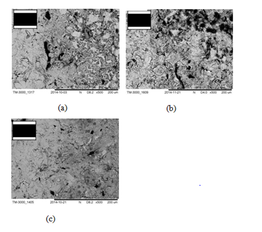 Figure 1 shows the surfaces of the specimens that went through the biphasic immersion process for 30, 60 and 90 days, respectively, after the cleaning process. The images correspond to the surfaces that were immersed in the interface between diesel and water, whose deterioration was more intense. The metal surfaces were found to be excavated and furrowed. This behavior suggested the presence of alveolar corrosion mechanisms.1
