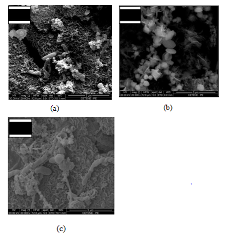 Figure 2 presents images corresponding to the biofilms deposited on the specimens exposed to the water/oil immersion system, at times 30, 60 and 90 days, respectively. Stretches of the surface of the specimens, which suggest to be corrosion products, extracellular polymeric material (MPE) involving some cells, and the presence of microbial forms, which suggest to be isolated bacterial cells, were observed.